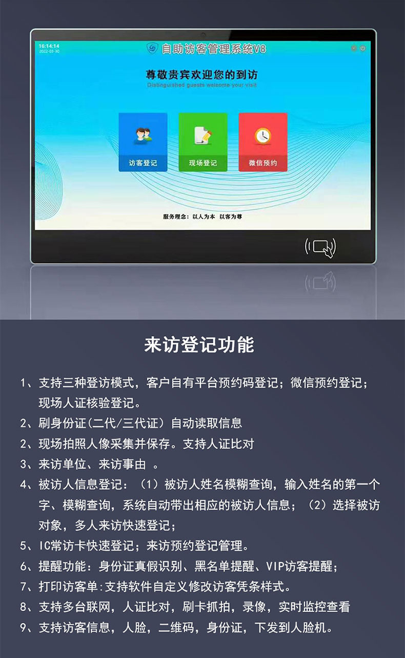 明創立式訪客機可以讀取身份證信息,高清攝像頭實現人證對比,人臉比對,可以打印核驗單,訪客