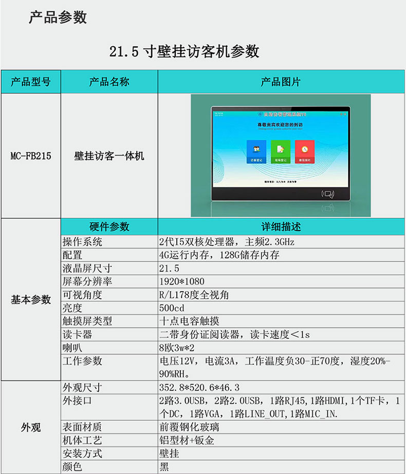 (*由于產品升級或其他原因,壁掛式訪客機產品實際參數有可能變更,以實際產品為準。本文中的所有陳述、信息和建議也不構成任何明示或暗示的擔保)