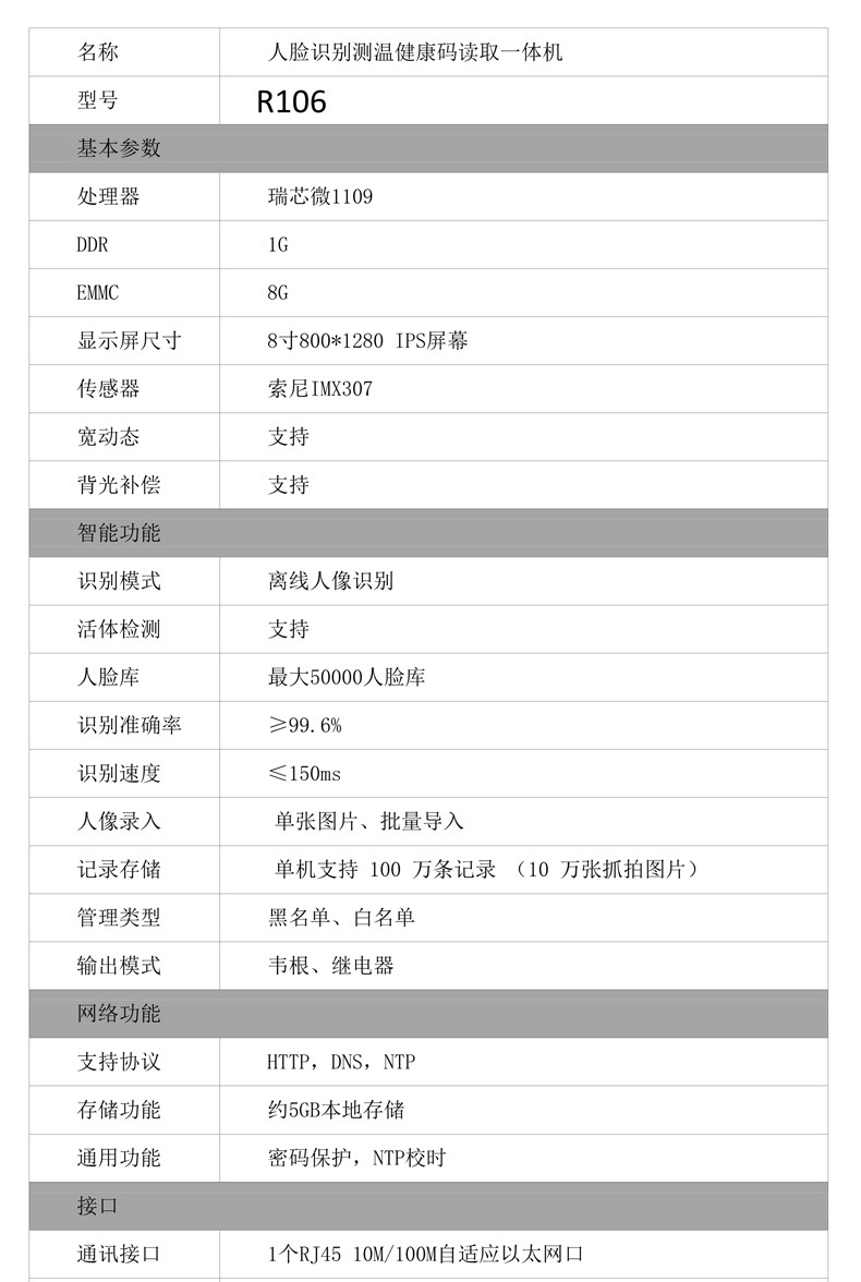 (*由于產品升級或其他原因,明創IDR-R106健康碼識別機產品實際參數有可能變更,以實際產品為準。本文中的所有陳述、信息和建議也不構成任何明示或暗示的擔保)