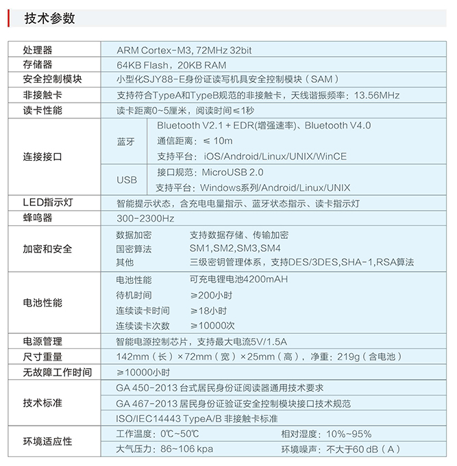 IDR240產(chǎn)品內(nèi)置公安部授權(quán)的小型化SJYY88-E身份證讀寫(xiě)機(jī)具安全控制模塊(SAM)和藍(lán)牙模塊,可讀取居民身份證信息,通過(guò)藍(lán)牙或USB接口上傳到計(jì)算機(jī)進(jìn)行解碼,實(shí)現(xiàn)居民身份證的有效性驗(yàn)證、存儲(chǔ)、查詢(xún)和打印,支持核查名單提示。可對(duì)接各類(lèi)業(yè)務(wù)系統(tǒng),可兼容讀寫(xiě)其他行業(yè)定制的基于TypeA、TypeB規(guī)范的行業(yè)非接觸卡。內(nèi)置大容量高能鋰電池,支持快速充電,智能電源管理提升續(xù)航能力。