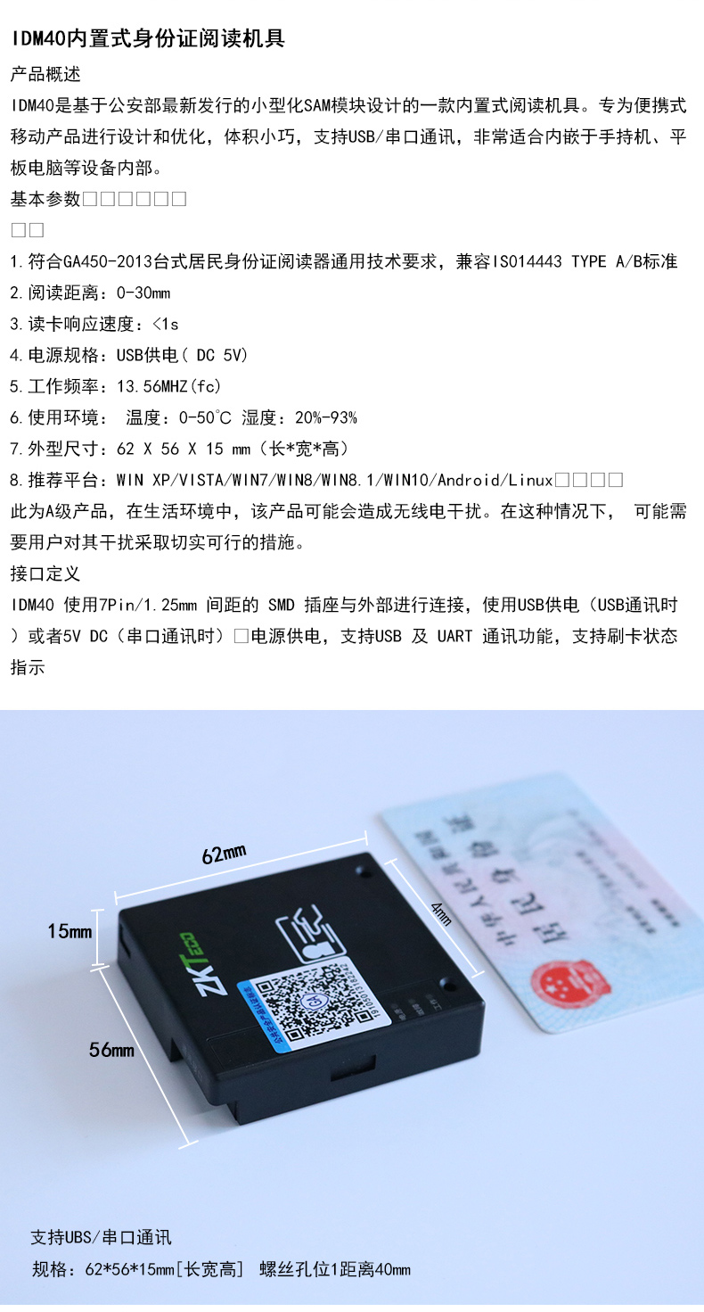 (*由于產(chǎn)品升級(jí)或其他原因,中控IDM40內(nèi)置式身份證閱讀機(jī)具產(chǎn)品實(shí)際參數(shù)有可能變更,以實(shí)際產(chǎn)品為準(zhǔn)。本文中的所有陳述、信息和建議也不構(gòu)成任何明示或暗示的擔(dān)保)
